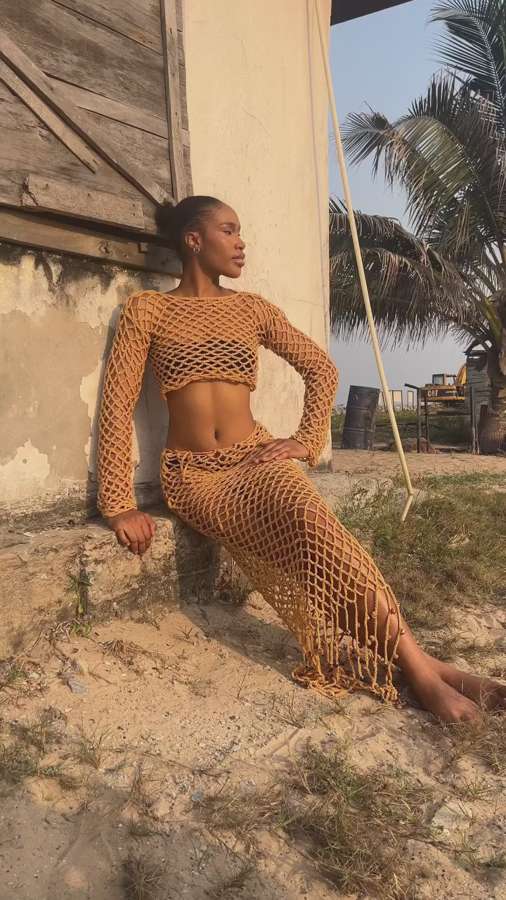 Zweiteiliges Set bestehend aus einem langärmligen Oberteil aus metallischem Elastan mit Rollkragen, kombiniert mit einer hoch taillierten Hose aus Baumwolle mit ausgestelltem Bein und elastischem Bund