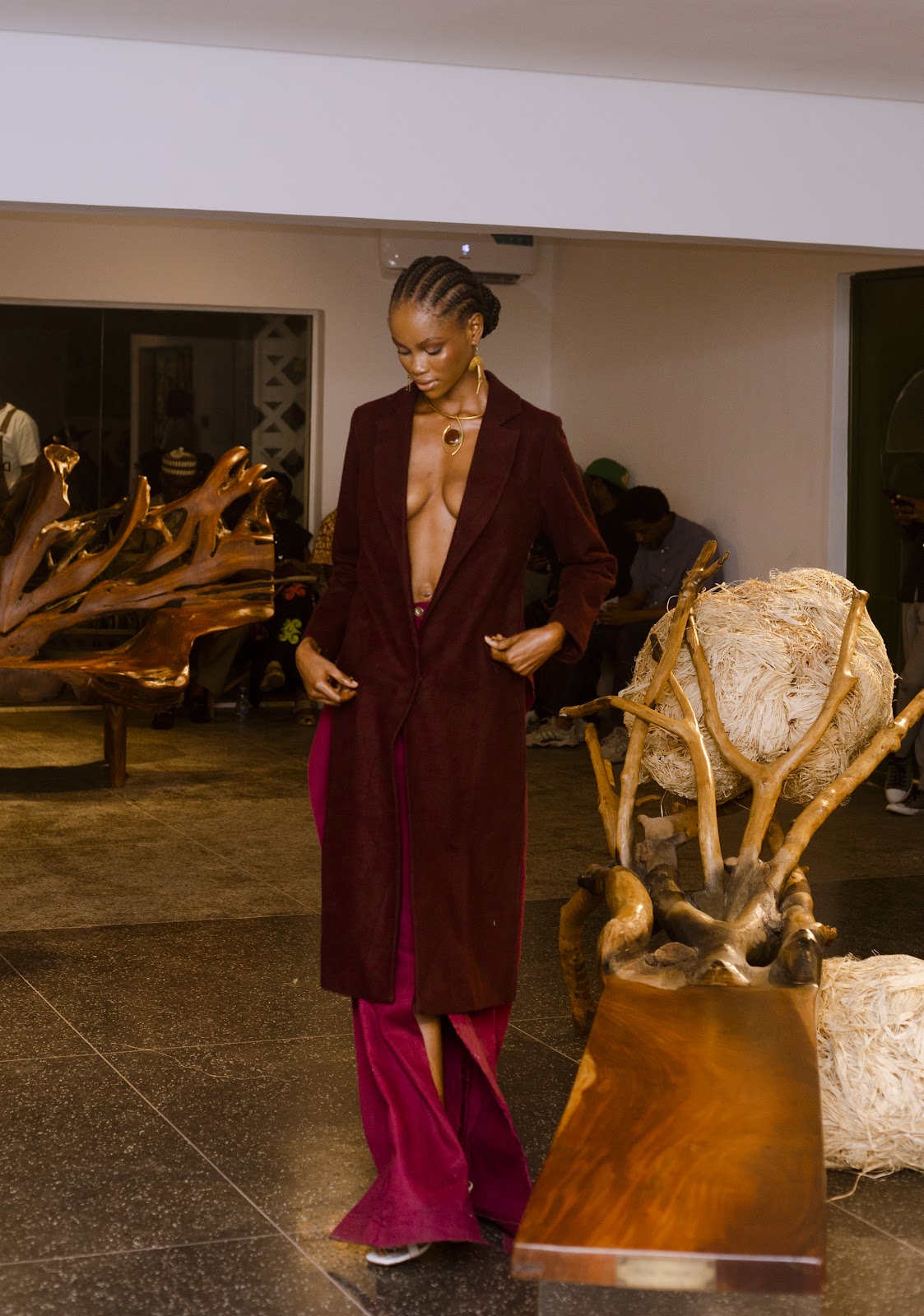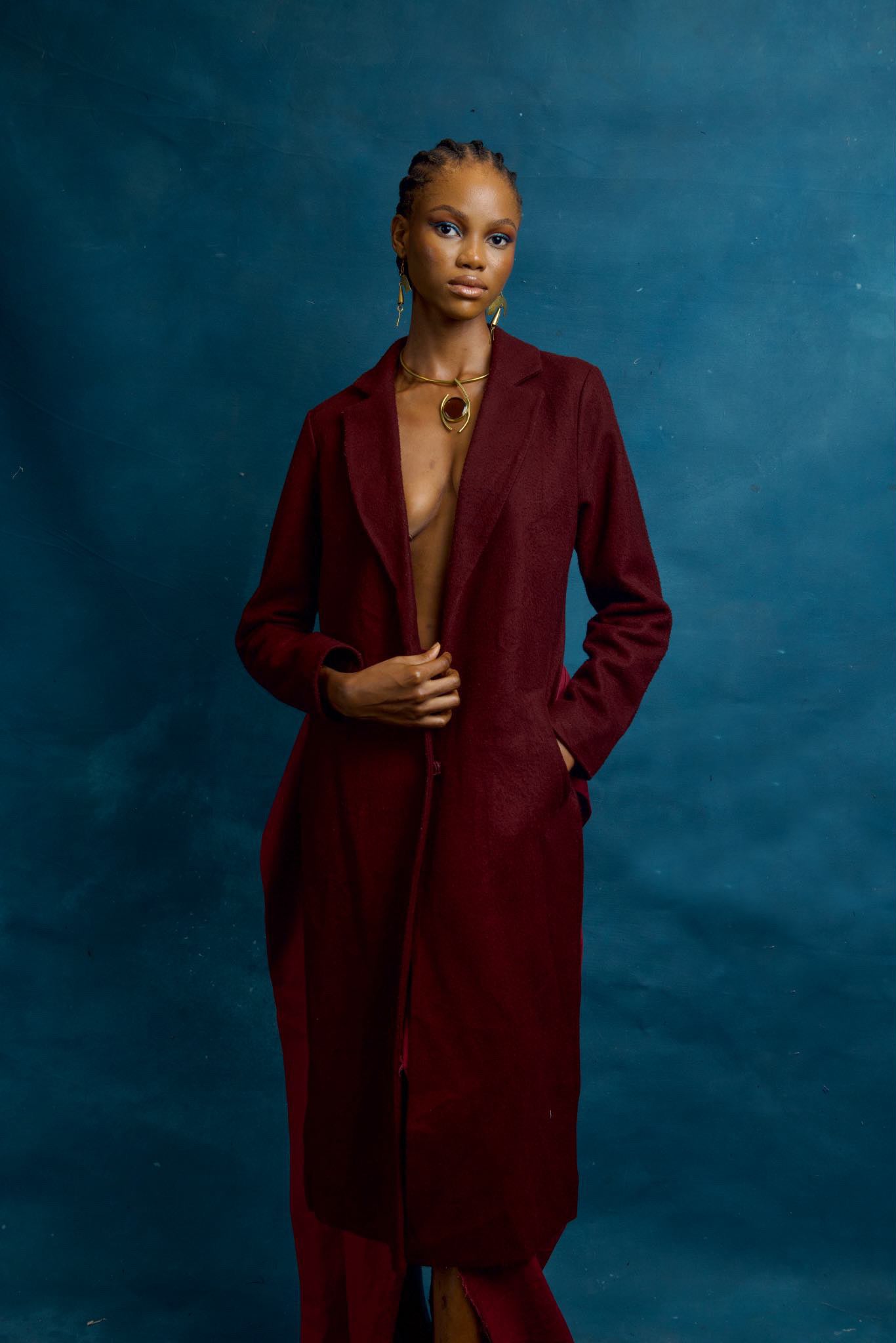 Dieser langärmlige, mittellange Mantel ist ein Upcycling-Stück mit offenem Rücken und Quasten aus Holzperlen.