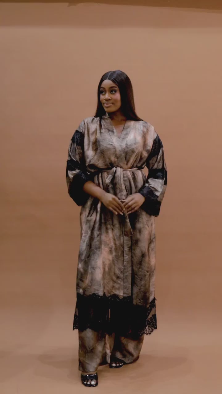 Este conjunto incluye una parte superior tipo capa con borlas y un cuello de cuerda largo que se puede atar, combinado con pantalones de pierna ancha.