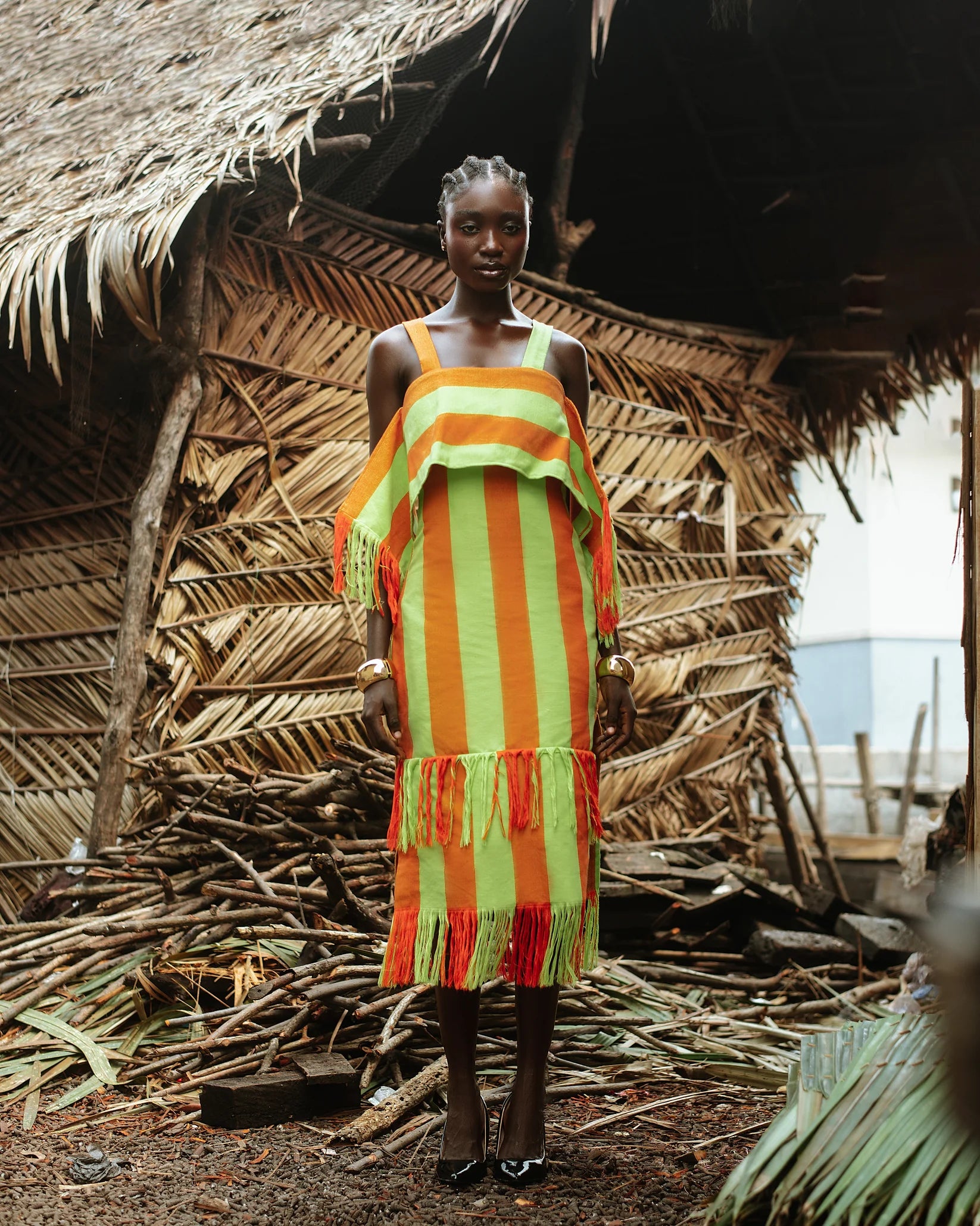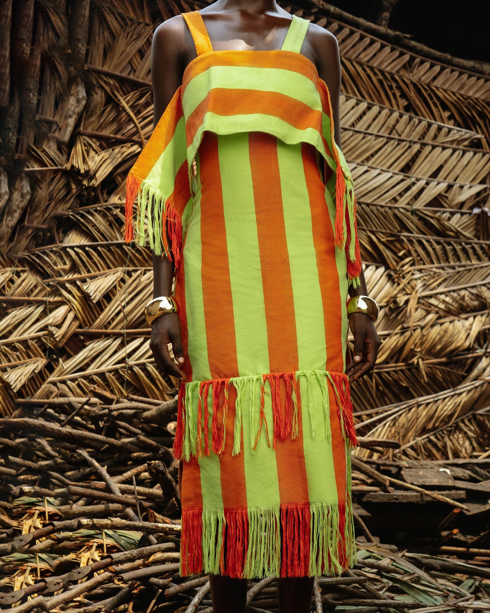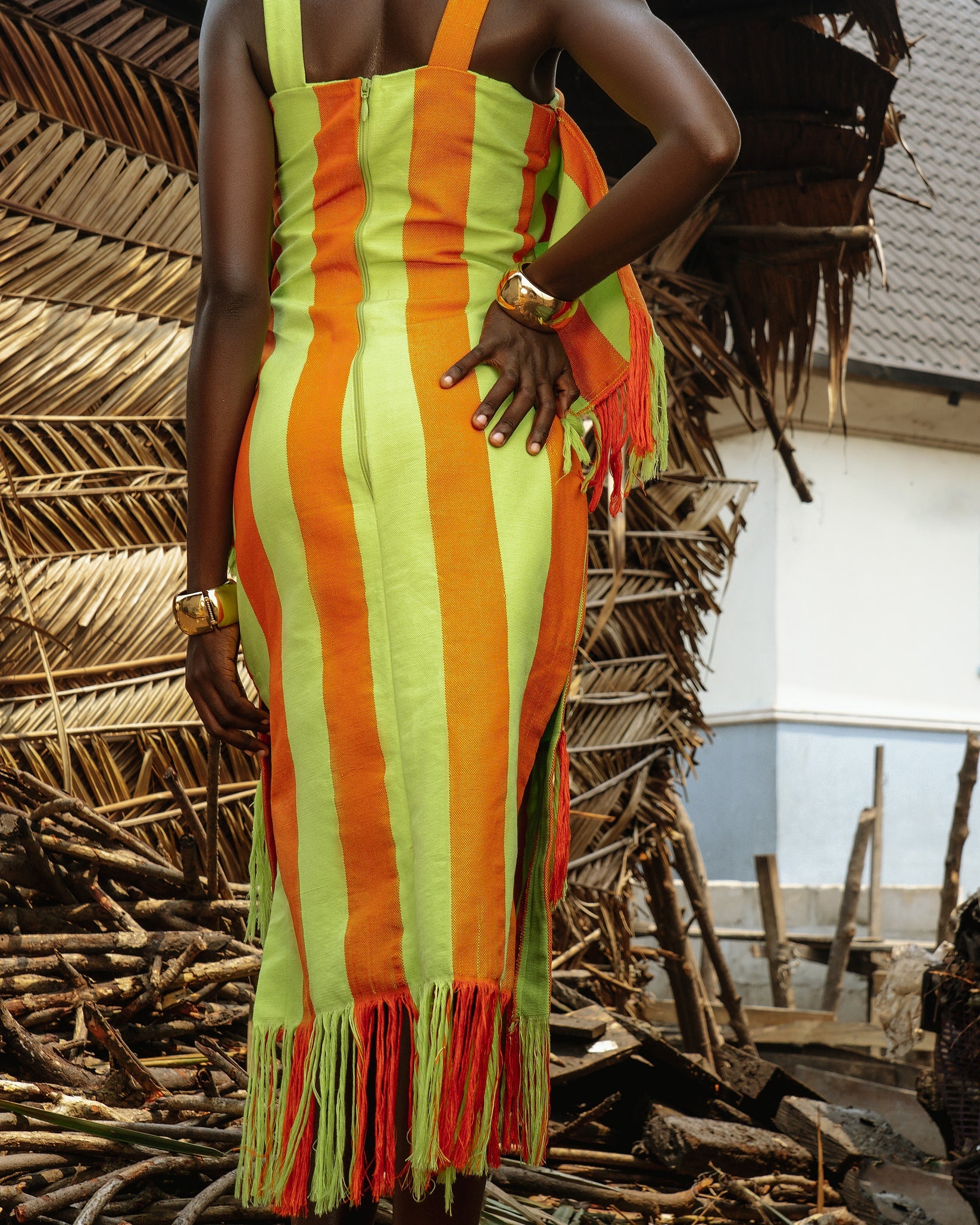 This statement dress is made from handwoven Akwete fabric, this dress is bold, breathable and full of character. The bright stripes and fringe details make it perfect for any special occasion.