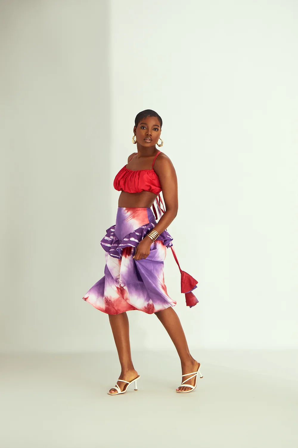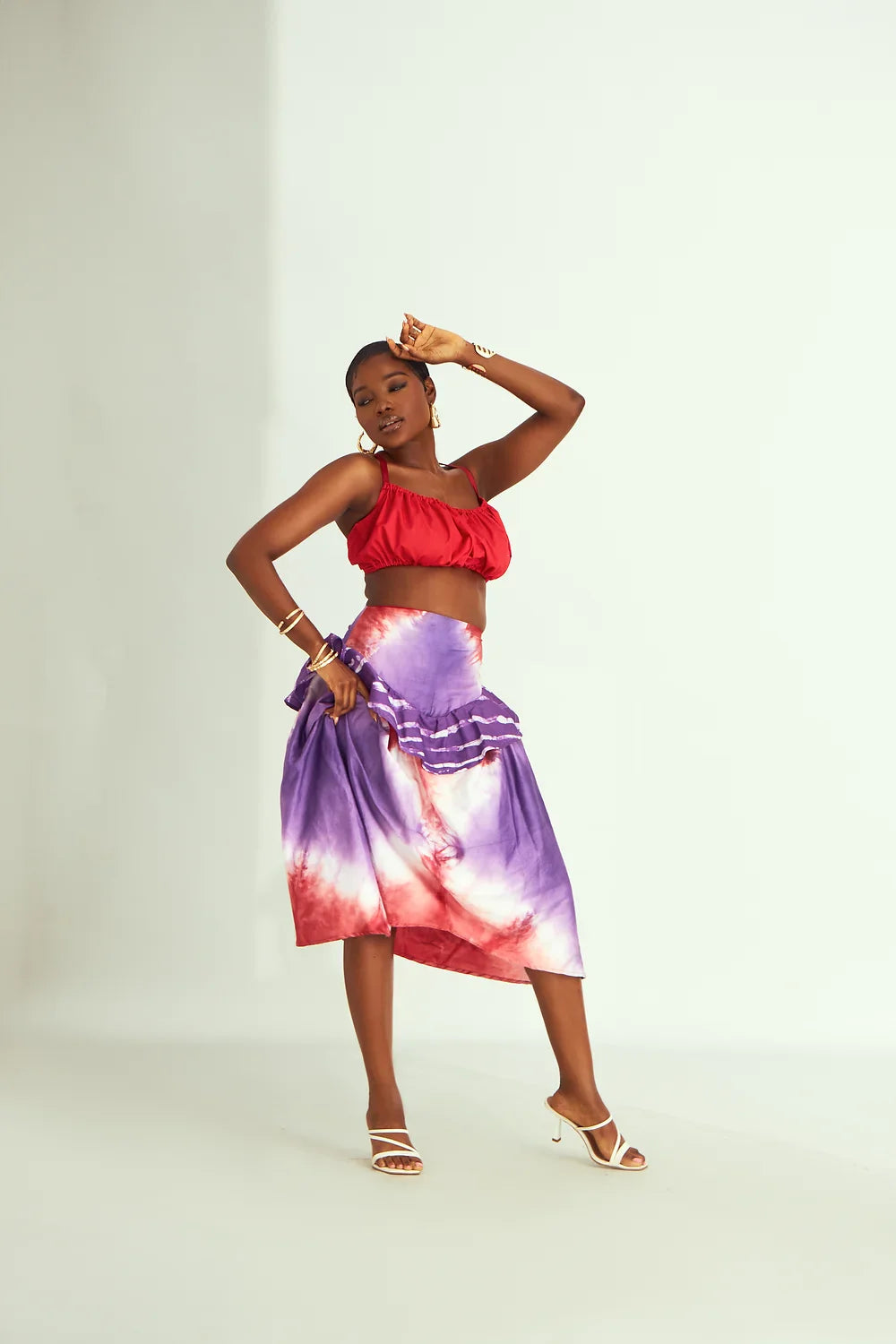 Un top de algodón con tirantes con cordones en la espalda y una falda acampanada con volantes en contraste. Este look sin duda añadirá un toque de color a tu armario.