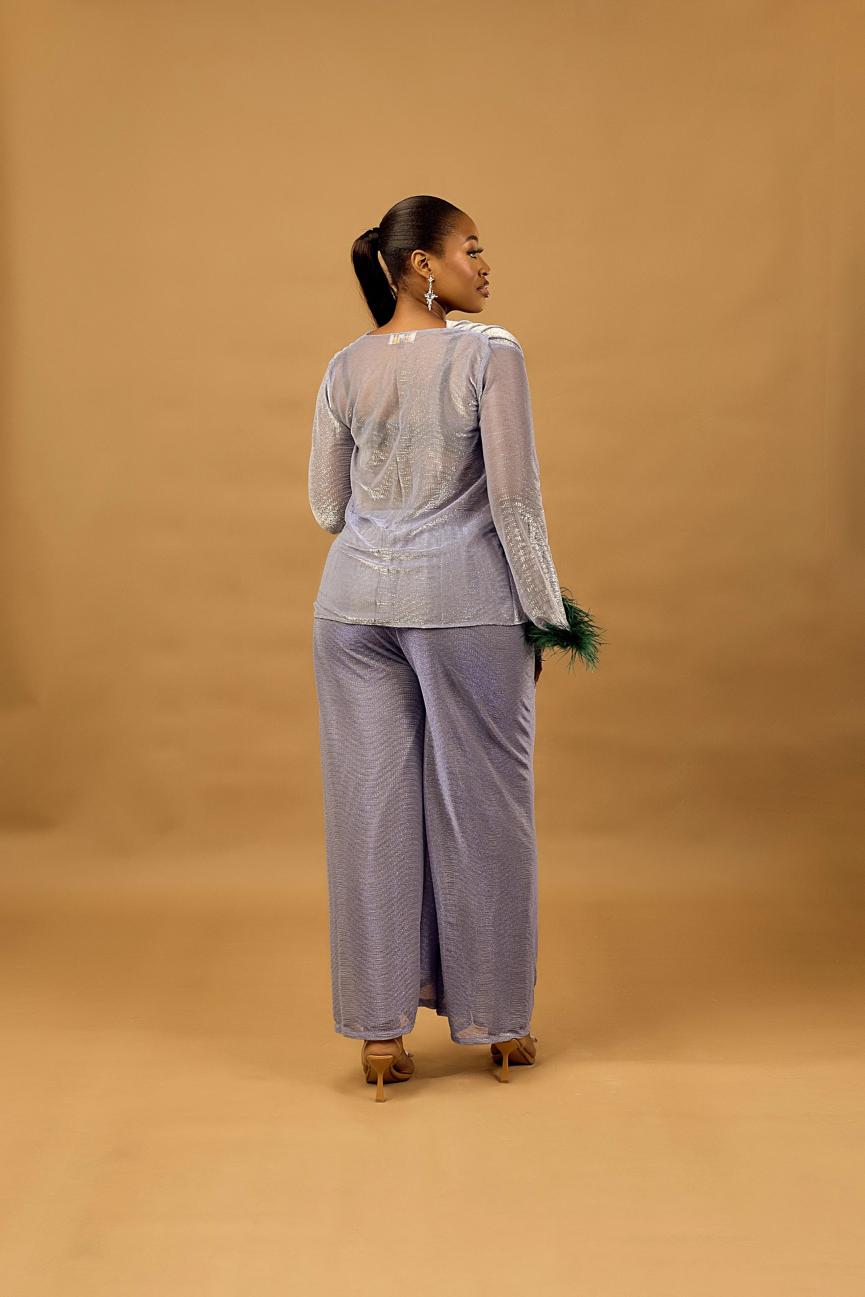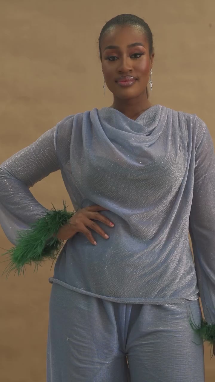 Este conjunto de dos piezas presenta una blusa de manga larga adornada con plumas y un cuello vuelto, combinada con pantalones de pierna ancha con cinturilla elástica.