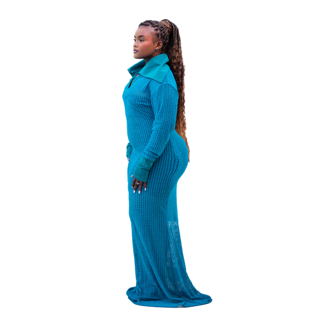 Nuestro cuello y mangas característicos se destacan en este vestido largo y la tela de encaje udoji.