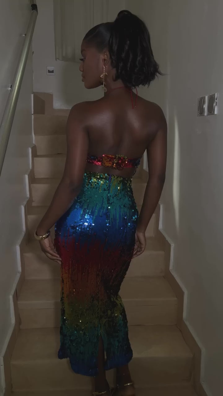 Features a halter neckline , low back neckline, ankle length and buckle strap detail at the back (adjustable for that extra fit).