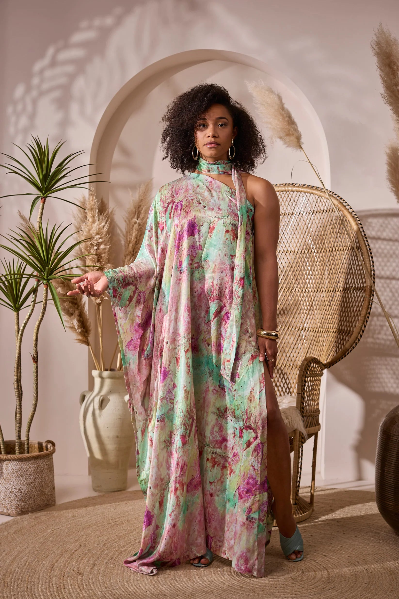 Our one-shoulder dress features a beautiful blend of floral patterns with a unique draped silhouette. Perfect for evening galas, cocktail parties, or intimate dinners, its asymmetry adds a modern edge while staying true to femininity and poise.