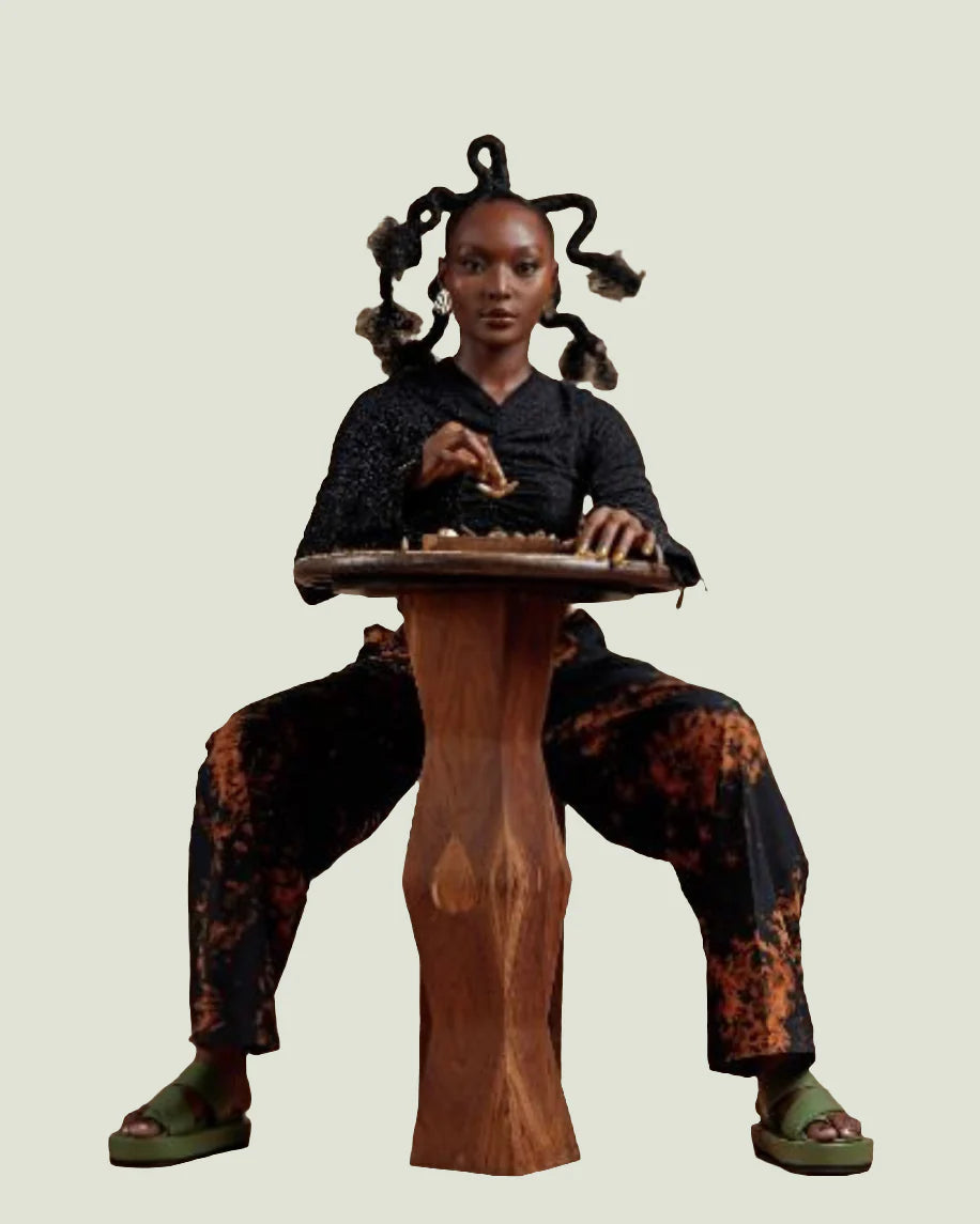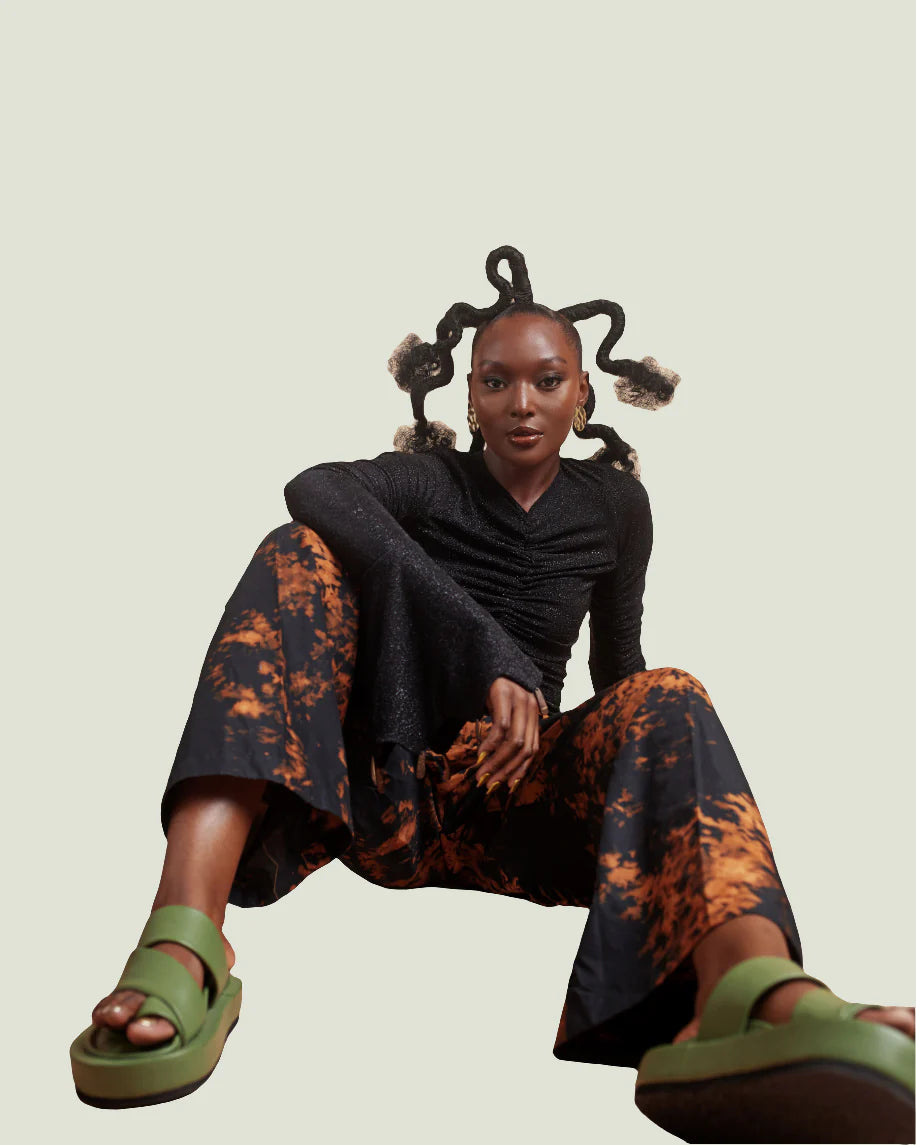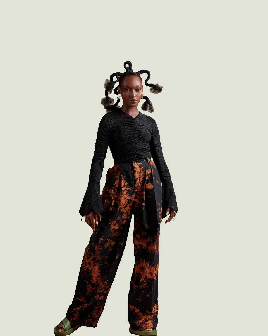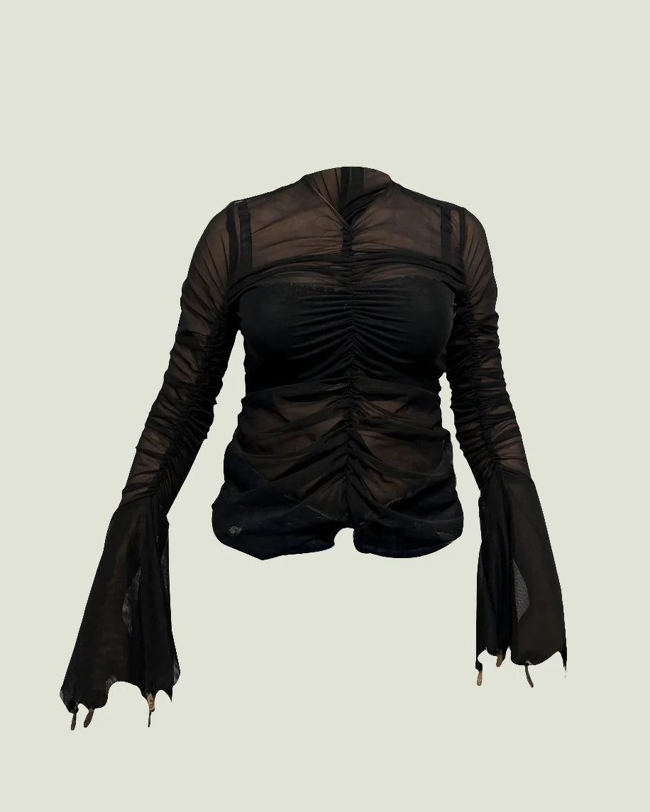 Koyin is a fitted high-neck, long bell sleeve with scallop details, and coconut teardrops mesh top with ruched detail at the centre front, centre back, and the front of the sleeve.