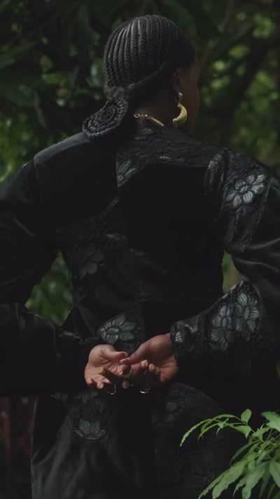 Crafted from a medley of hand tacked velvet and lace to create a puzzle effect, featuring a statement architectural sleeve design, cinched in waist, curved mini bottom and front split zipper detail, Nkili is straight to the point and easy to wear, making it a go-to outfit for moments when you want to be unforgettable.