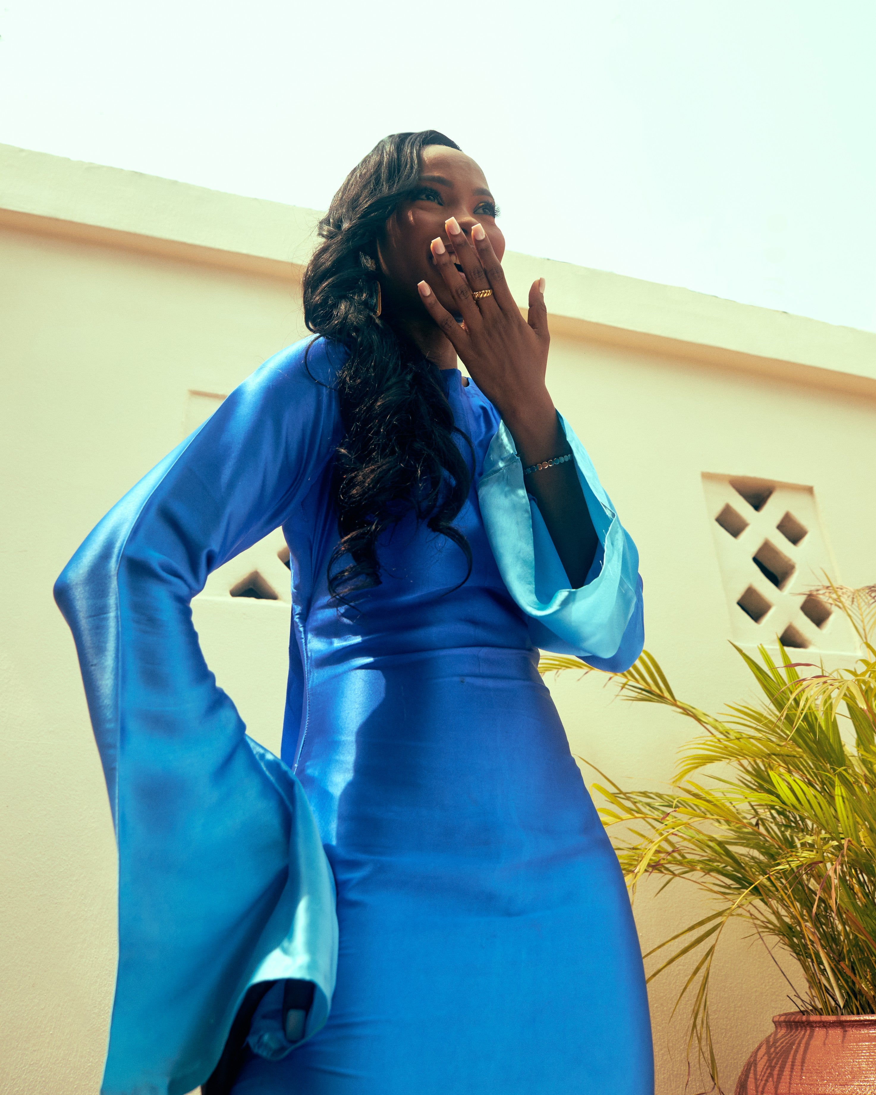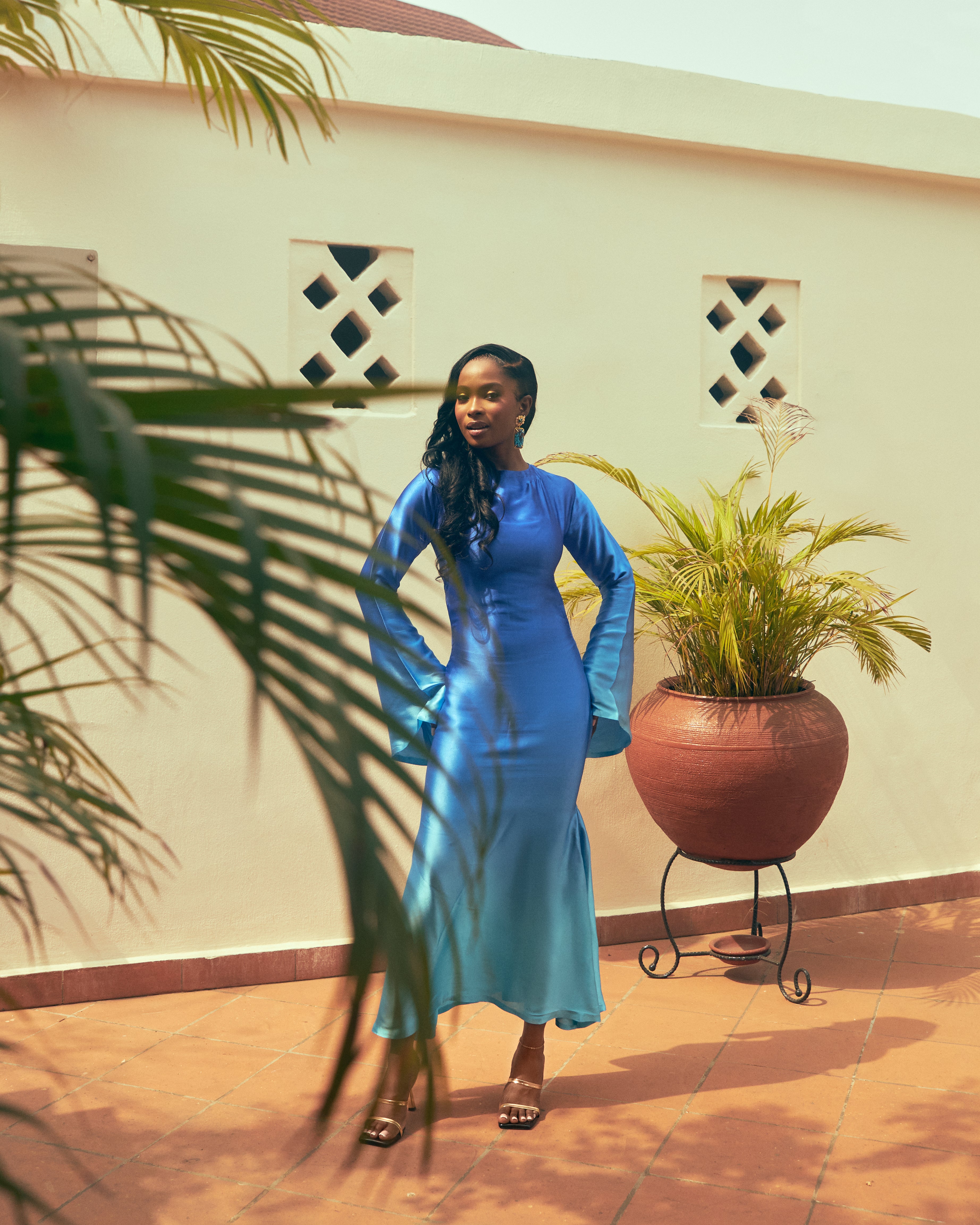 A beautiful maxi-length dress featuring long flared sleeves. The cutout detail at the back with an elastic band and adjustable ropes at the back of the neck gives this dress the versatility of being both a day and night look.