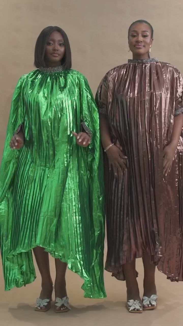 Pleated polyester bubu featuring a beaded high neck and beaded sleeves