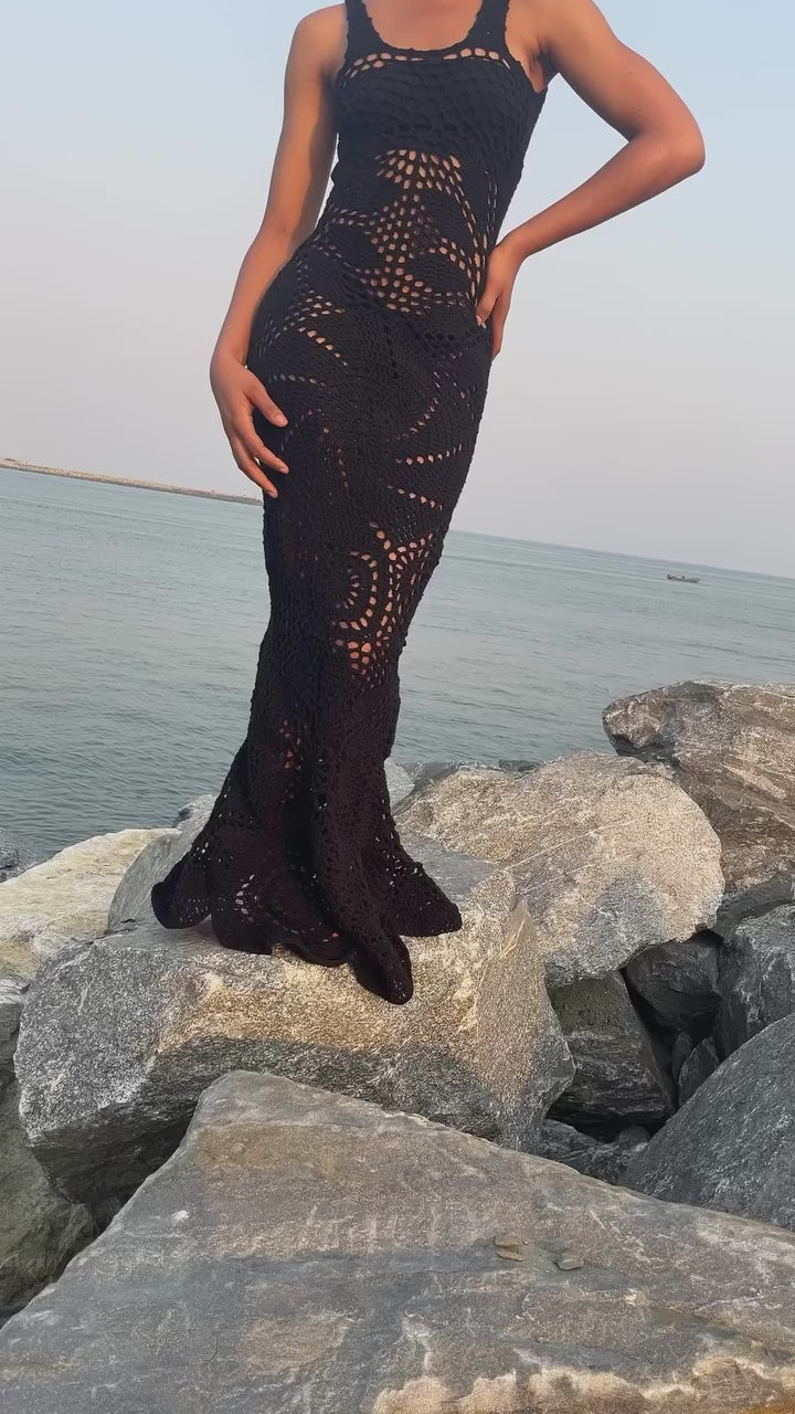 Black sleeveless maxi crotchet dress with a round neckline and intricate patterns.