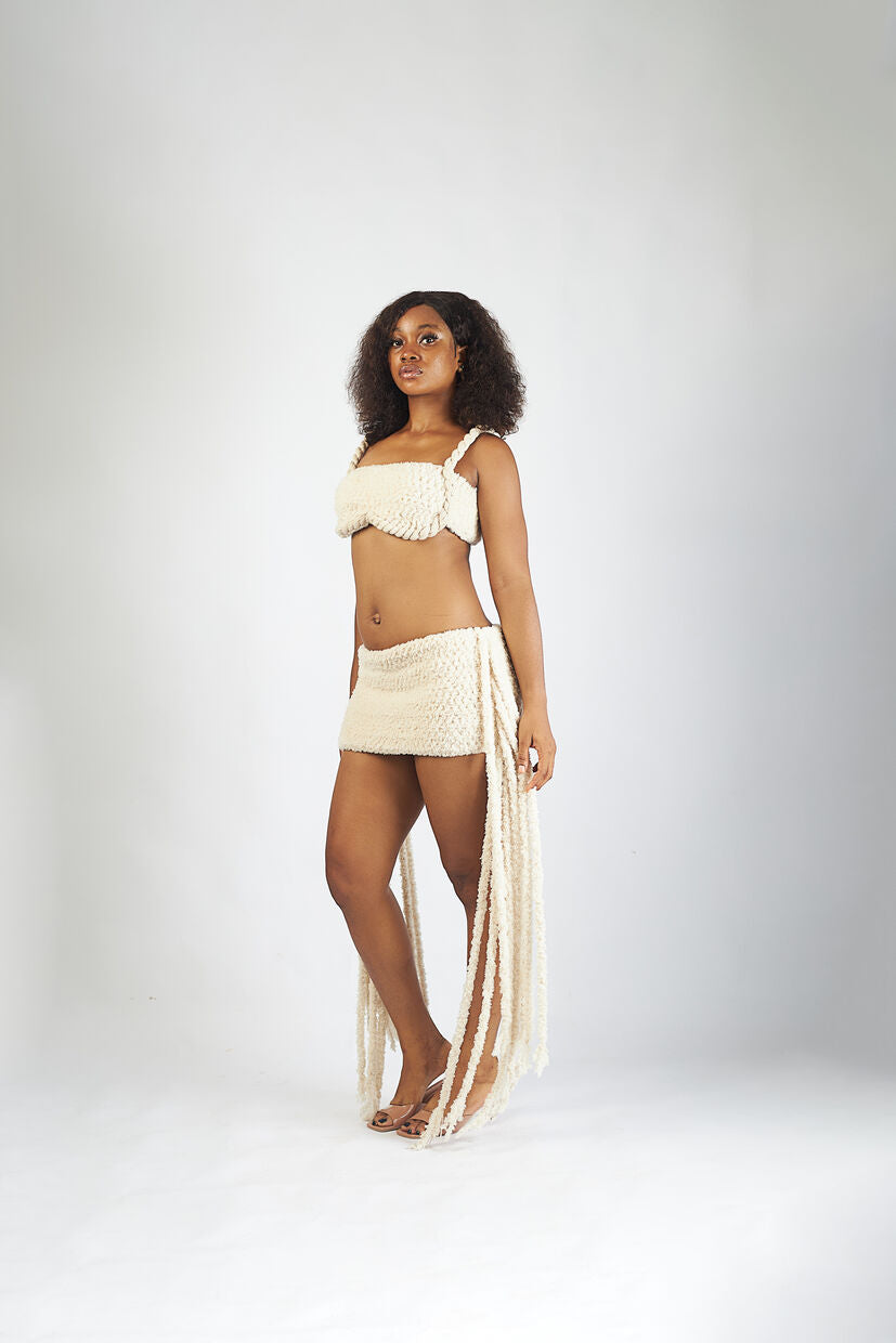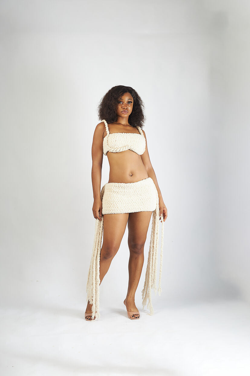 Crotchet set, includes a crop top with braided sleeves and a mini skirt adorned with long tassels on the sides
